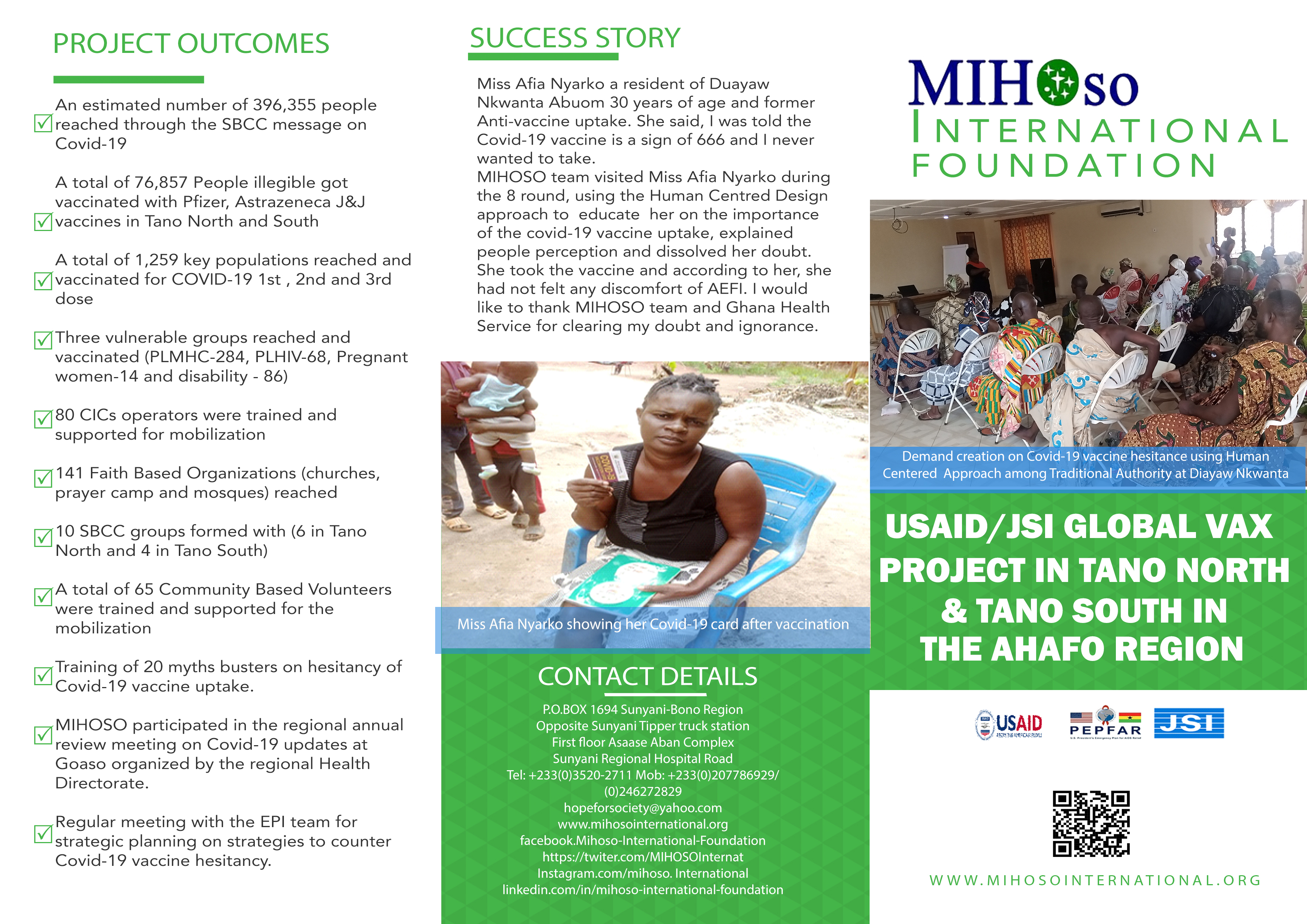 In 2022, MIHOSO International Foundation a subgrantee of USAID/JSI Strengthening the Care Continuum Project in the Ahafo Regions received an addendum to implement the USAID initiative for Global Vaccine Access (Global Vax) project in collaboration with Ghana Health Service in both Tano North & Tano South Municipal. The goal of this project is to provide support to the Government of Ghana (GOG) and to accelerate Ghana's progress in attaining the 95-95-95 UNAIDS targets by achieving epidemic control in the three (3) regions thus Western, Western North and Ahafo Regions. The target beneficiaries of the project were all persons, 15 years and above including pregnant women, PLHIV, people with disability, migrant populations and KPs (FSW, MSM). The project was implemented within a 6 months period, with funding from USAID through JSI.